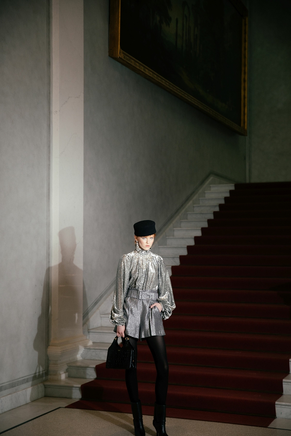 Silk Chiffon Dress with Ruffles and Stand Collar