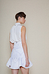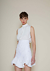 Diese ärmellose Bluse überzeugt durch ihre duftige und leichte Silhouette. Der rüschenbesetzte Stehkragen wird vorne von einer zarten Schleife bekrönt. Ein Knopf in der hinteren Mitte sorgt für ein komfortables An- und Ausziehen.