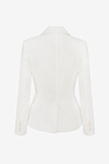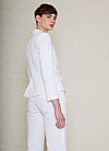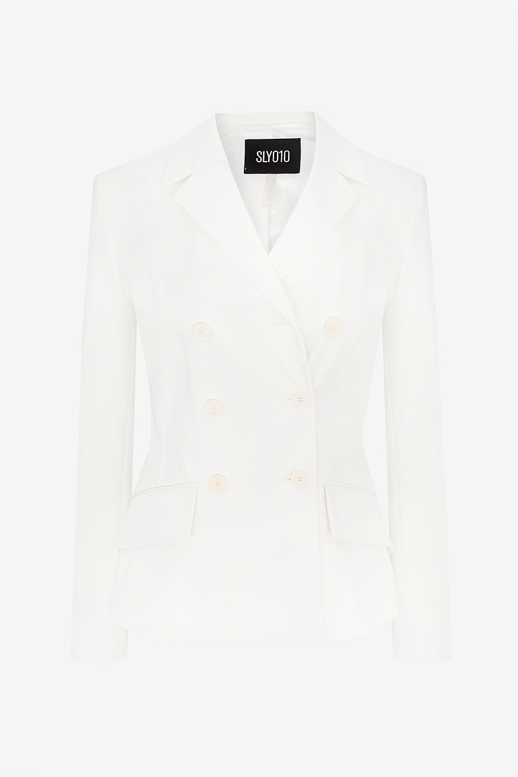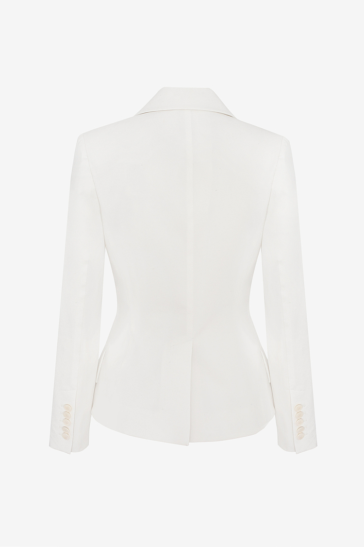 "Ein schöner, kurz geschnittener Zweireiher, der mit der schmalen Passform an die Stilikonen 50er Jahre erinnert. Die feminine Sanduhrsilhouette bekommt durch den legeren Stoff eine lässige Note und macht ihn zu einem Allrounder.