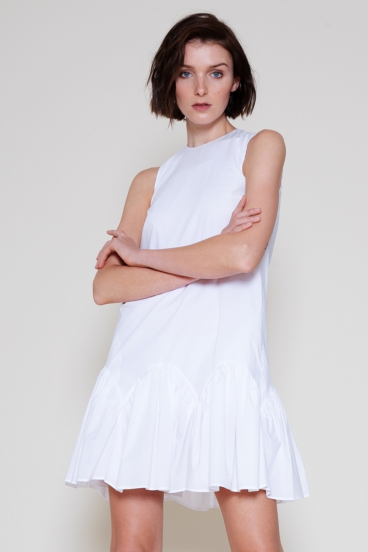 Dieses leicht ausgestellte Kleid aus Baumwoll-Popeline mit Stretchanteil überzeugt durch die voluminösen Volants am Rock, welche in einer aufwändigen Schnittführung gefertigt wurden. Das ärmellose Model hat in die Seitennähte eingearbeitete Eingrifftaschen, um eine gewisse Praktikabilität zu gewährleisten. Der rückwärtige Reißverschluss ist mit einem Satinband verziert, wodurch das Kleid optisch gestreckt wird.