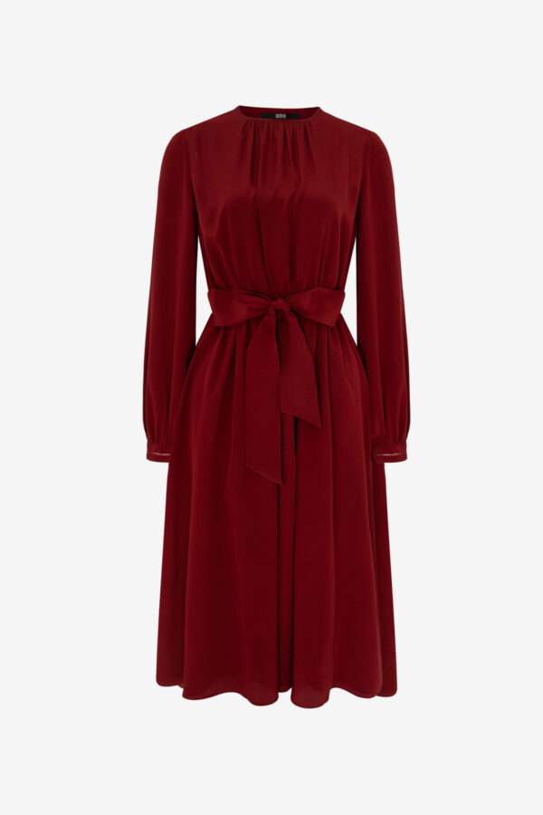 "A beautiful silk dress with a clean and easy going silhouette. The lovely draped silk around the waist conceal and make the dress slightly light and fresh. The charming volume gives a fine and feminine touch.