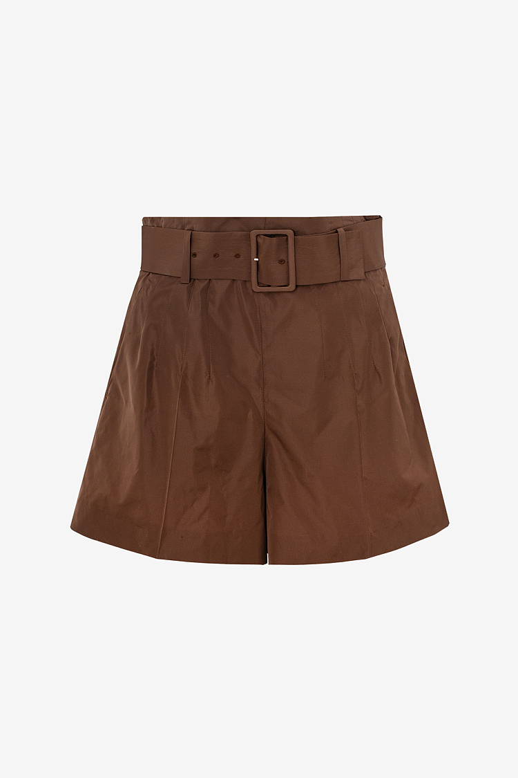 Refined high-waisted shorts featuring a structured waistband and a matching belt with a square buckle. The subtly flared leg creates a flattering A-line shape, elevated by a delicate sheen from the premium fabric blend. Easy to dress up or down — pair with silk blouses or knitwear. Made in Europe.
