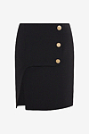This beautiful mini skirt is a true all-rounder. Combined with high boots or casually with a sweater, the accentuated waist always ensures a feminine look. The asymmetrical center front and decorative buttons make this skirt a special statement.
