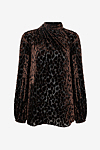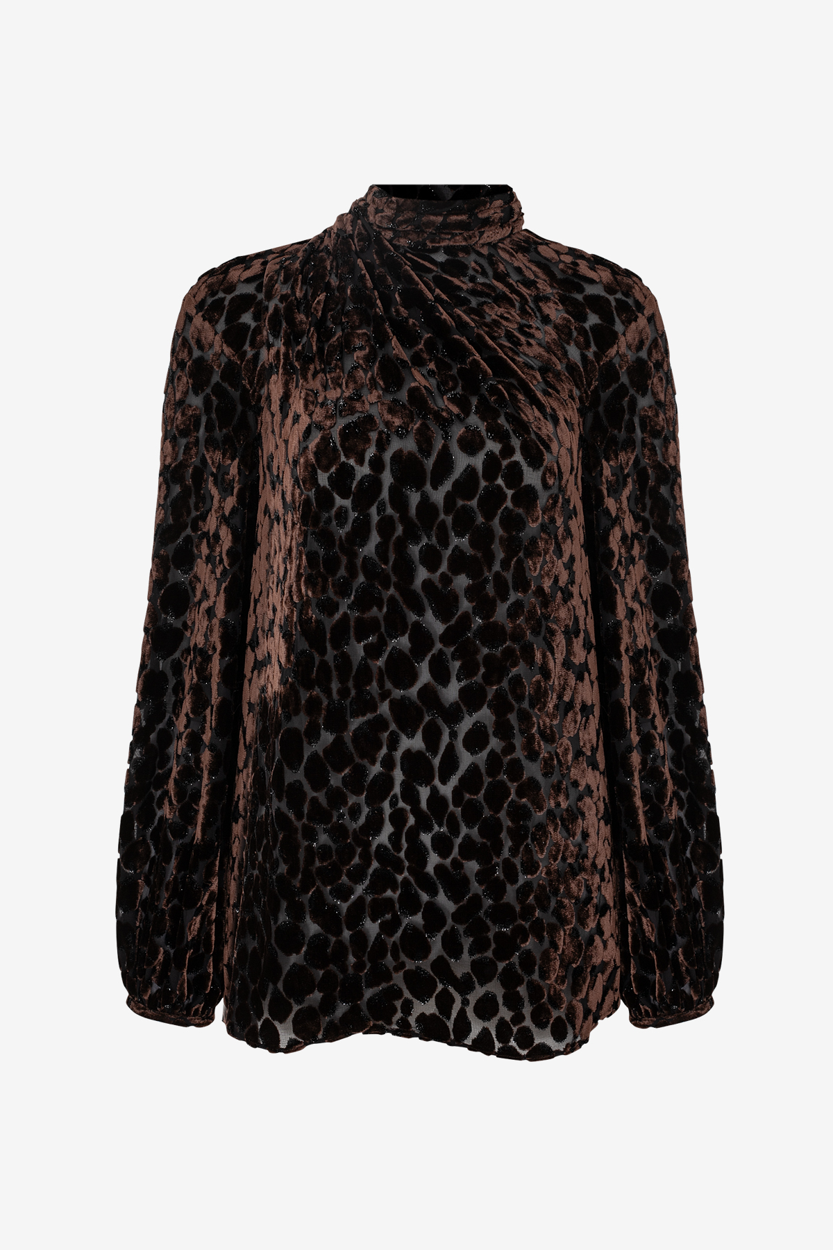This elegant blouse is crafted from shimmering Luxury Lurex Devoré, impressing with its delicate transparency and sophisticated texture. The softly draped neckline adds a modern touch and enhances the fluid silhouette.
