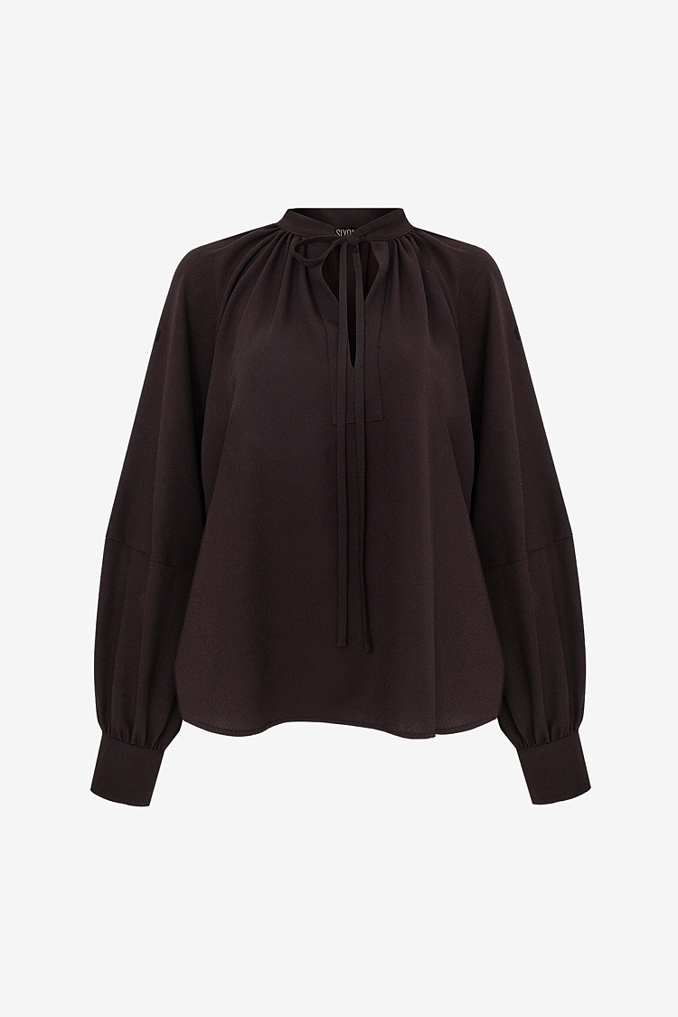 A narrow stand-up collar with a front slit and tie detail creates a feminine accent, complemented by gently draped raglan sleeves and wide cuffs.
