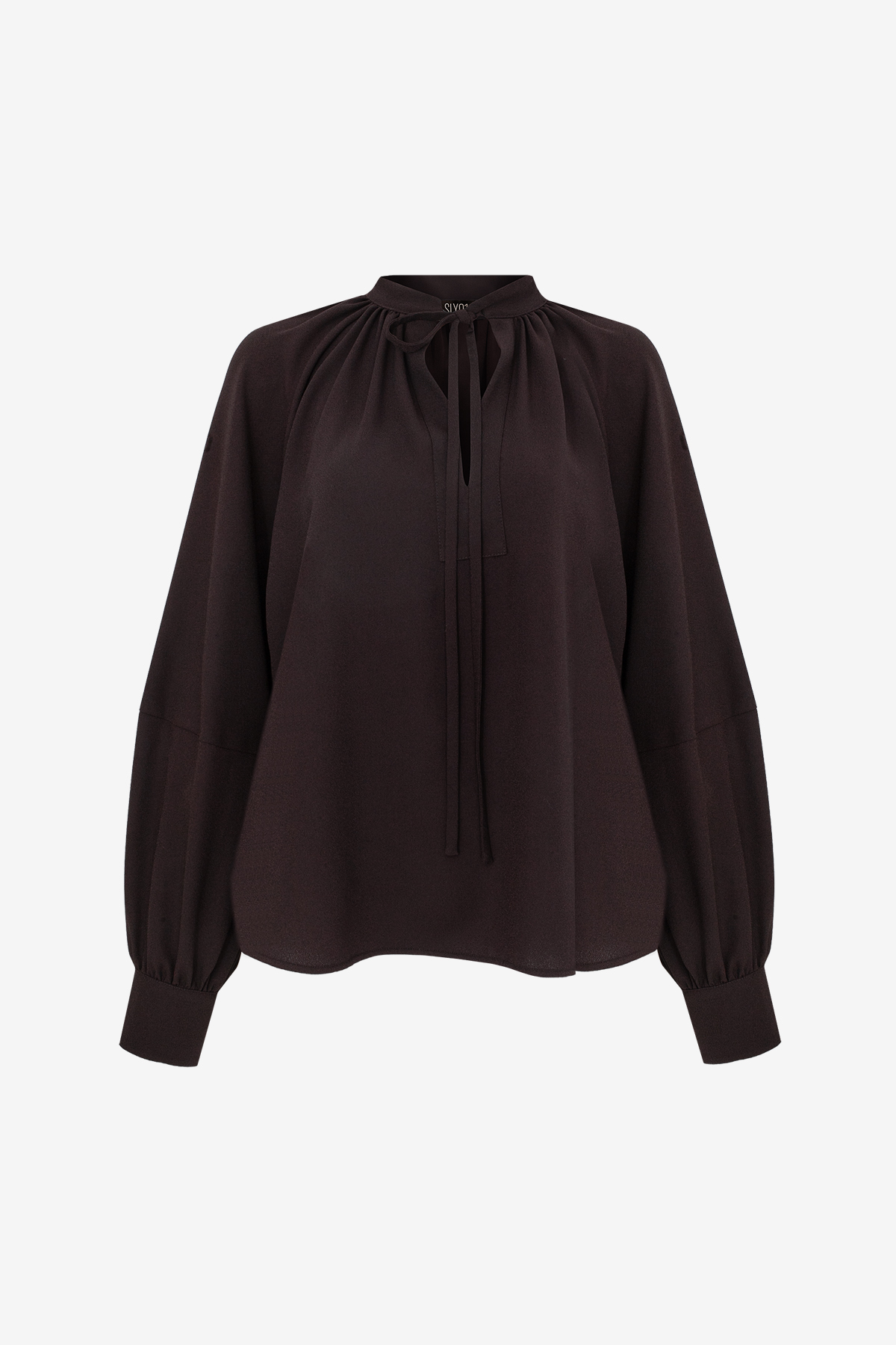 A narrow stand-up collar with a front slit and tie detail creates a feminine accent, complemented by gently draped raglan sleeves and wide cuffs.