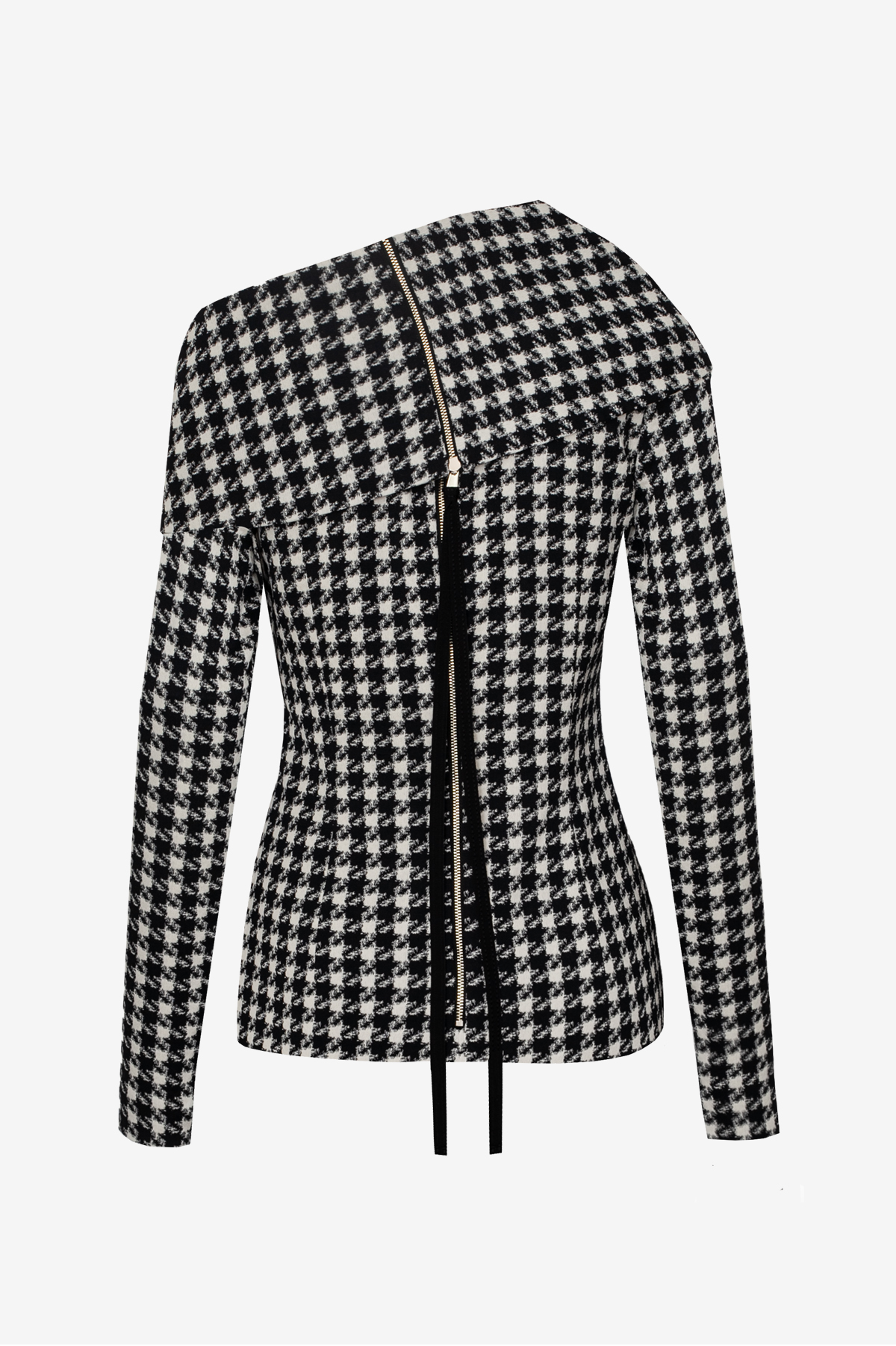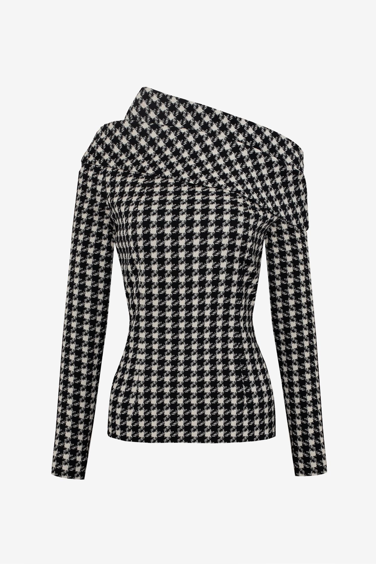 This sculpted long-sleeve top blends classic pattern heritage with contemporary construction. Crafted from high-quality pied-de-poule fabric, it features a precisely contoured silhouette and a striking draped neckline. The structured material enhances the defined shape, while the refined design lends a modern yet timeless elegance to any look.