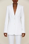 This single-row blazer is characterized by its broad lapel. Three rounded patch pockets make this fitted jacket a little bit more sporty and give the slightly stretched body more structure. The cotton fabric used for this piece has a soft feel and gives the style an elegant, yet nonchalant appearance.