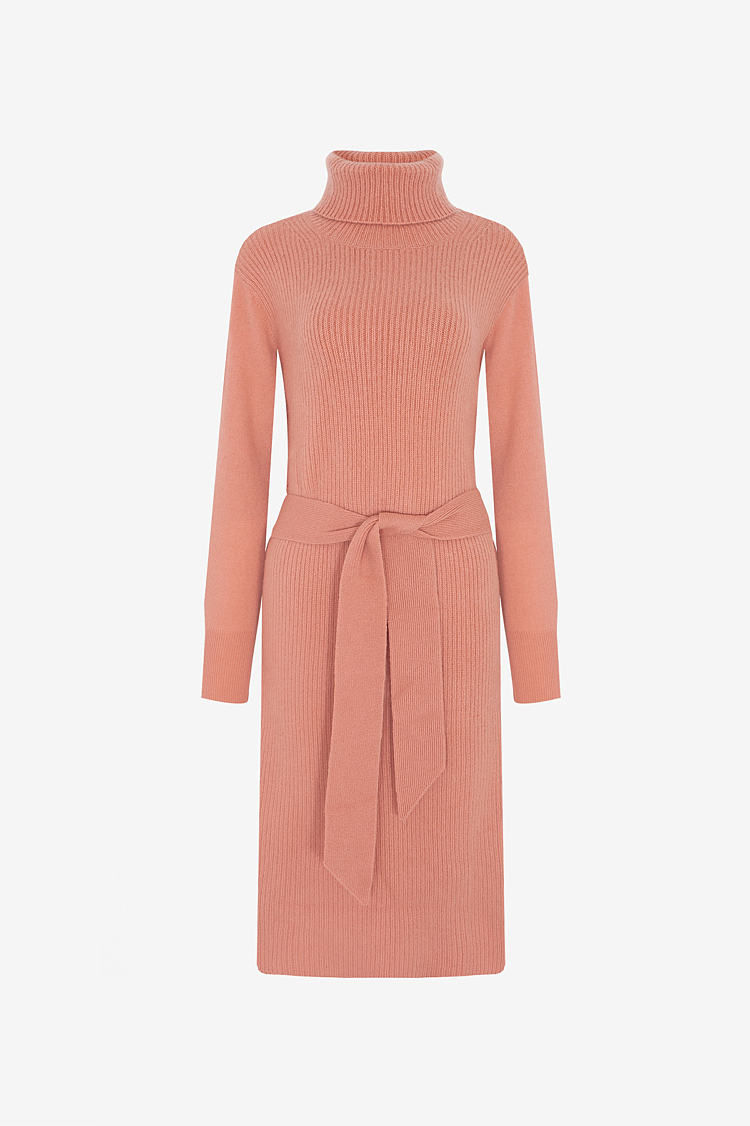 "A young and fashionable rib-knitted dress. The minimalistic Scandinavian design will focus the ribs, the silhouette and the cozy turtleneck. The cool and casual apparel is made by the belted base and the high quality of yarn and knitting.